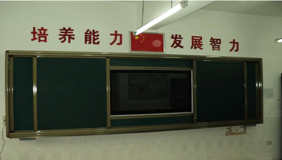 2. 外滑軌裝置:安裝兩塊移動綠板,兩綠板尺寸之和與內軌道白板的尺寸一致;進行常規教學時,可將此綠板滑動到液晶電視前方,保護液晶觸摸一體機,增大書寫面積;進行多媒體教學時,將綠板拉開,使用液晶觸摸一體機。